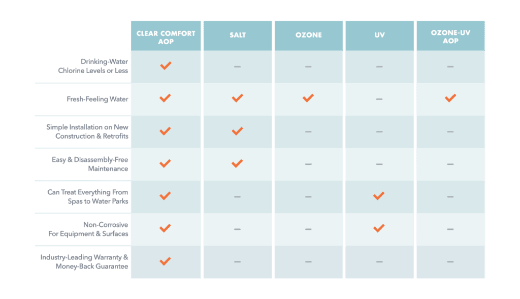 Operating in everything from spas to water parks, Clear Comfort’s AOP is 2 – 5X more powerful than the other sanitation methods.